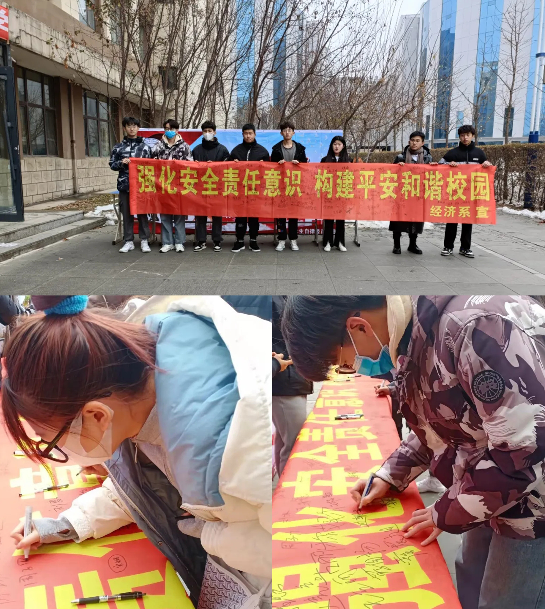 【学团】11月初,经济系组织学生干部在第二教学楼门前,开展“强化安全责任意识,构建平安和谐校园”暨经济系校园安全活动月启动仪式。在活动现场,同学们积极踊跃,纷纷在条幅上签上自己的名字,以此响应强化安全意识的重要性。此次活动在宣传防火、防盗、防诈骗的安全常识外,也在积极倡导学生,每天做好寝室通风、公共场所戴好口罩、无特殊情况不离校、不外出等安全常识。通过此次签字活动的开展,进一步提高了广大学生的安全防范意识,提高了安全防范能力,筑牢了安全底线思维。(根据经济系供稿修改 通讯员:黎明东)