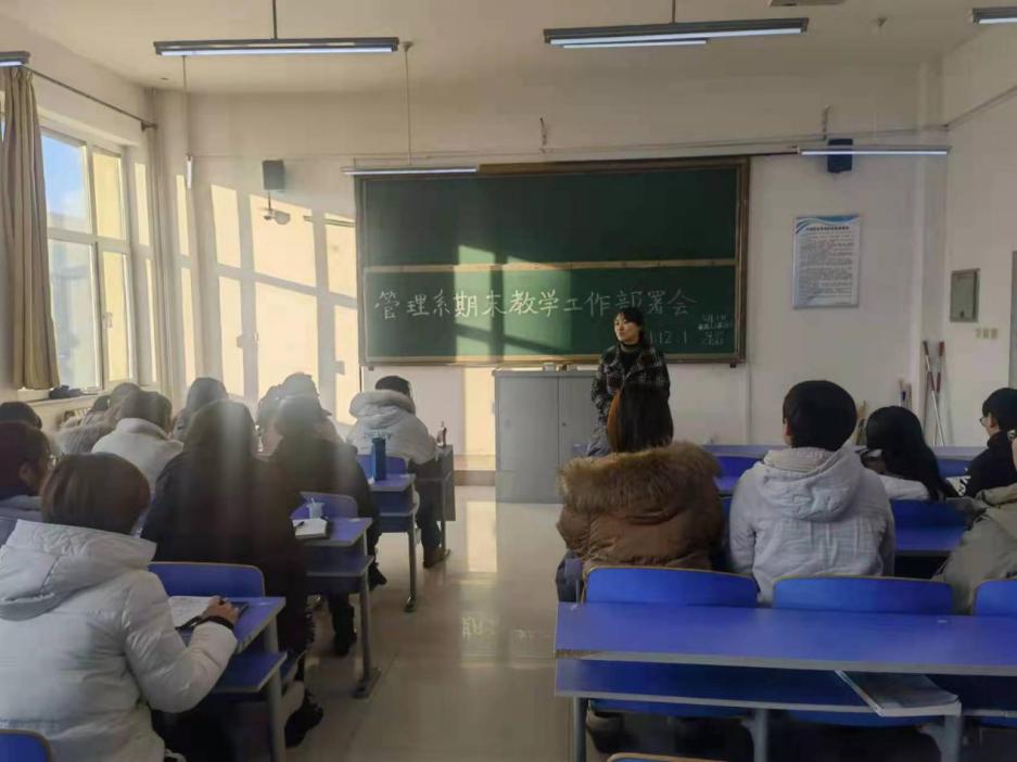 【教学】12月1日,管理系在第二教学楼317教室召开期末教学工作部署会,教学副主任郑鑫主持会议,全体专任教师参加了本次会议。会上,郑鑫提出要“上好最后一课”,注意各章知识点的有效链接,指导学生进行积极、有效地复习,随时为学生答疑解惑。会议强调了期末考试监考老师需要注意的事项,希望全体教师严格按照考务工作安排和监考人员职责,保质保量地完成好期末考试监考工作,同时,及时总结该学期课程的授课情况,在未来的教学工作中更上一层楼。(根据管理系供稿修改 通讯员:焦争昌)