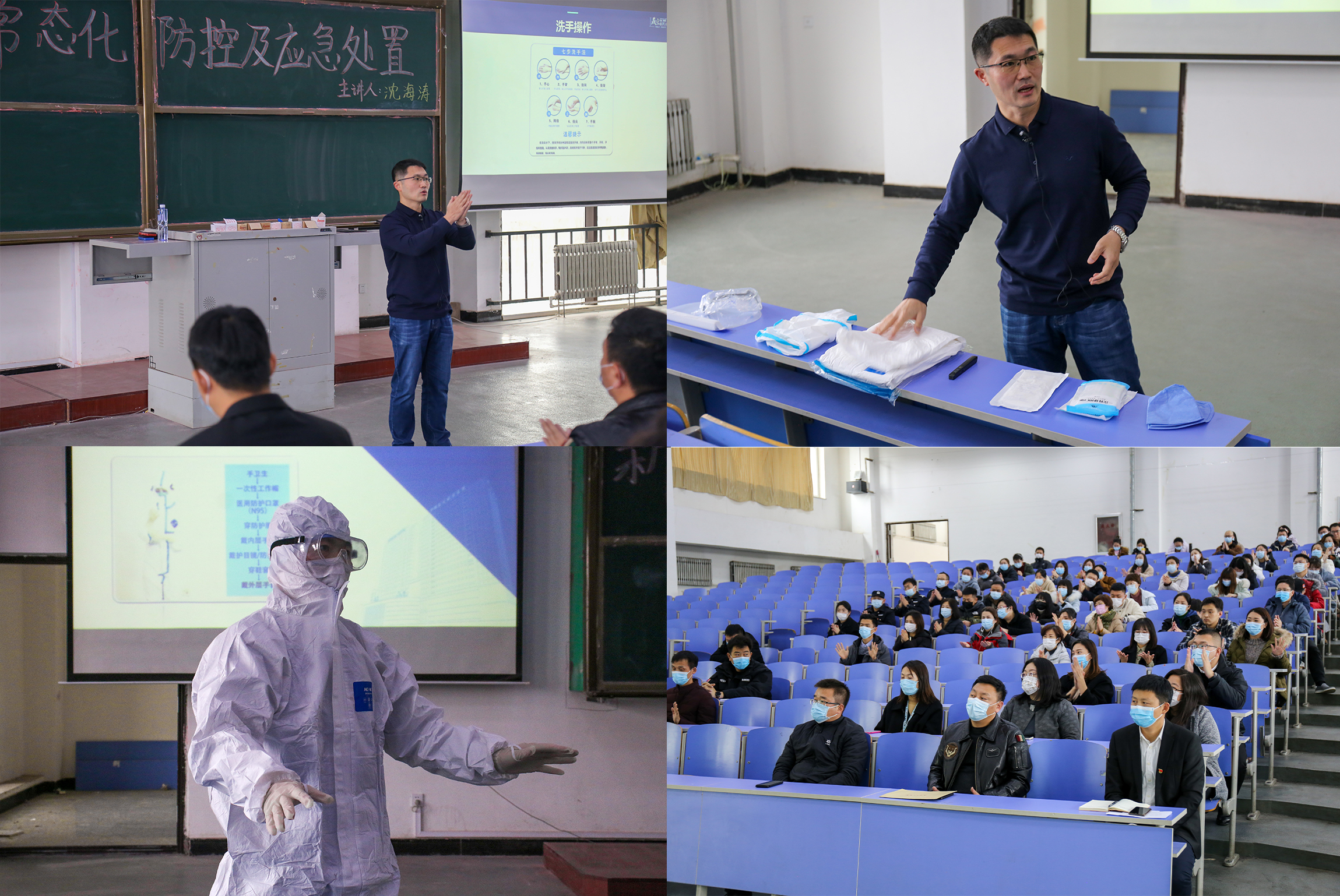 沈主任就手卫生知识及七步洗手法进行培训,用七步洗手法清洁手部污物和细菌,预防接触感染,减少传染病的传播。随后沈主任针对防护服的穿脱方式进行培训。有效提高了我校教职员工熟练掌握穿脱防护服的程序及注意事项,为应对疫情来临时能迅速投入战斗奠定了良好基础。