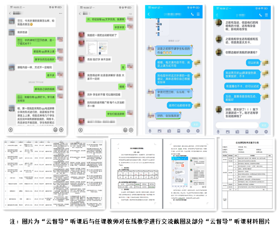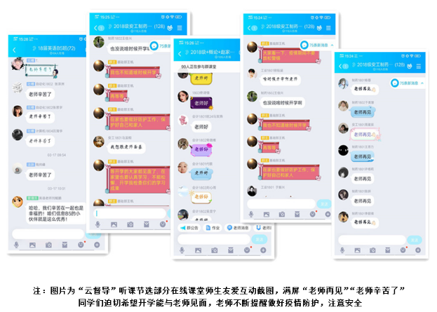 “云督导”与任课教师和学生每日相见于“云课堂”,“穿梭”在各大教学平台之间,“隐身”于各教学群组之中,准时“上课”、按时“下课”,云上与教师勤沟通,跟学生多交流。疏通教师与各教学平台的联系,协助教师解决在线教学技术难题,引导教师不断改进教学方法,帮助任课教师不断提升线上教学能力,形成“疏通、协助、引导、帮助”多功能于一体的督导机制,以督促教,师生管导相协调,确保线上教学质量不下降,学生线上学习不打折。