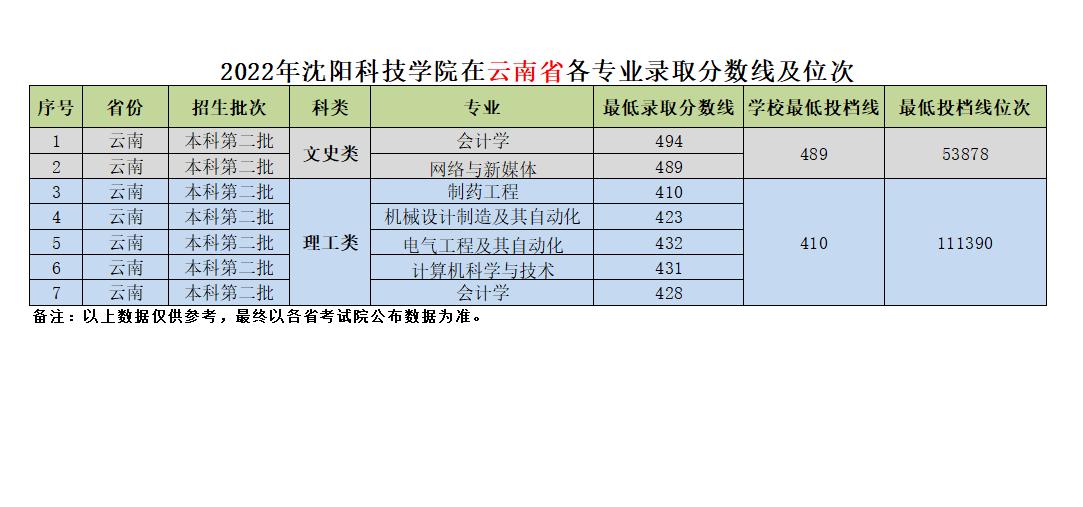 我校在云南省近三年各专业录取分数线及位次