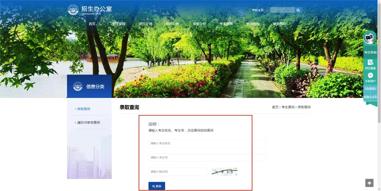 第一步:登录学校官网首页,点击“招生就业”,进入“招生信息网”,点击“考生查询”,进入“录取查询”系统。