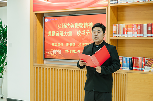 活动最后,图书馆馆长郝雷与机械工程系党总支书记赵雷鼓励同学们要珍惜当下的幸福生活,努力学习、积极工作,为实现中华民族伟大复兴的中国梦而努力奋斗,并表示要坚持举办此类活动,让更多的师生了解抗美援朝历史,传承抗美援朝精神。