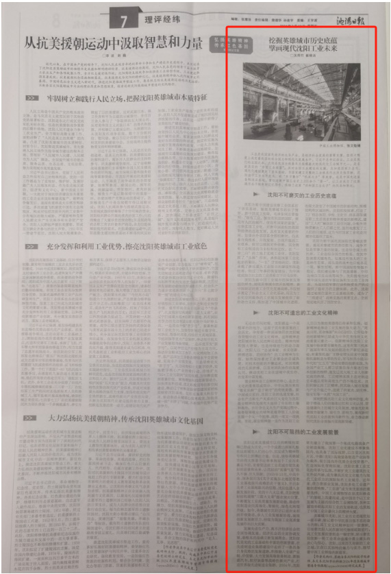 近日,沈阳日报刊登了我校经济系教师关雨竹、崔晓洁撰写的文章《挖掘英雄城市历史底蕴 擘画现代沈阳工业未来》,该文章系沈阳市社科联2024年度英雄城市塑造专项课题(syyxcs202408)研究成果。文章充分体现了工业成为推动沈阳可持续发展的强劲引擎,也突出了工业对于塑造沈阳这座英雄城市深厚底蕴的重要作用。