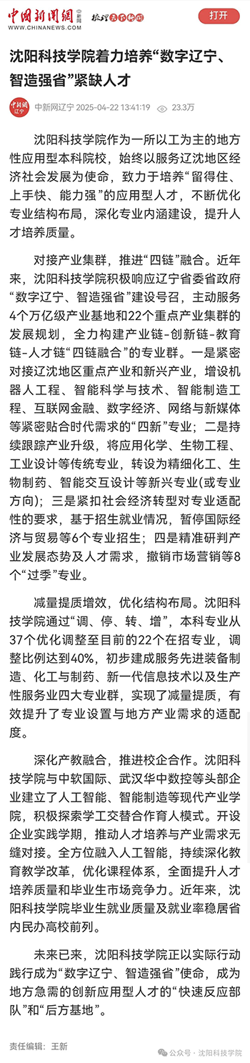 月22日,中国新闻网以《开云电子(中国)总部着力培养“数字辽宁、智造强省”紧缺人才》为题,对我校