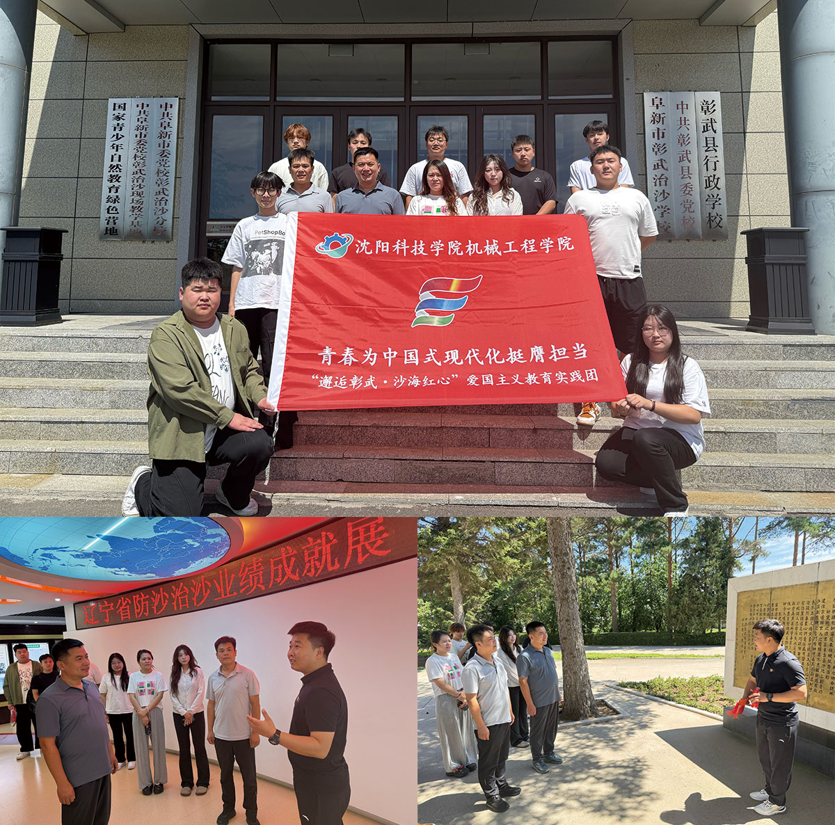 机械工程学院“邂逅彰武 沙海红心”实践团奔赴阜新市彰武县,开展“学习治沙精神”主题实践。在固沙所治沙成果展馆,通过历史照片、实物展品与影像资料,同学们系统学习了三代治沙人“向沙宣战、植绿固沙”的奋斗历程,深刻体会从“沙进人退”到“林海连绵”的生态奇迹。随后,实践团走进万亩松林,踩着沙土穿行林间,近距离观察固沙植物生长状态;在工作人员指引下登上守望塔,直观感受治沙成果的壮阔。实践团结合实践内容,思考“机械技术如何优化治沙设备、提升固沙效率”,让大家在感悟治沙精神的同时,进一步明晰专业学习与生态保护的结合点,厚植“艰苦奋斗、久久为功”的责任担当。